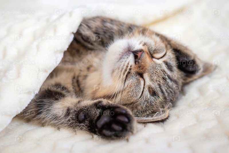 Симпатичный маленький серый полосатый котенок спит на кровати на теплом уютном бежевом одеяле. Концепция отдыха, релаксации, праздника