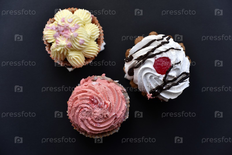 Сладкие пирожные со сливками на черном фоне. Вкусные пироги на завтрак на черном фоне