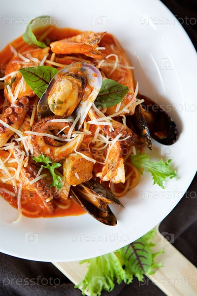 Паста с морепродуктами - креветки, моллюски и осьминоги, подается с сыром и листьями базилика и красным соусом