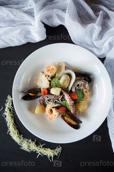 Моллюски с креветками и осьминоги подаются с сыром и базиликом