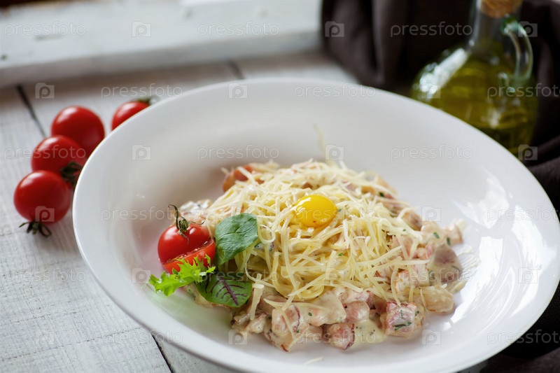 Паста с беконом, белым соусом и свежим перепелиным яйцом. Подается на белой тарелке с красными помидорами