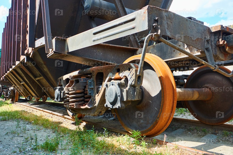 Крупные планы деталей железнодорожного вагона. Перевозка различных материалов на дальние расстояния