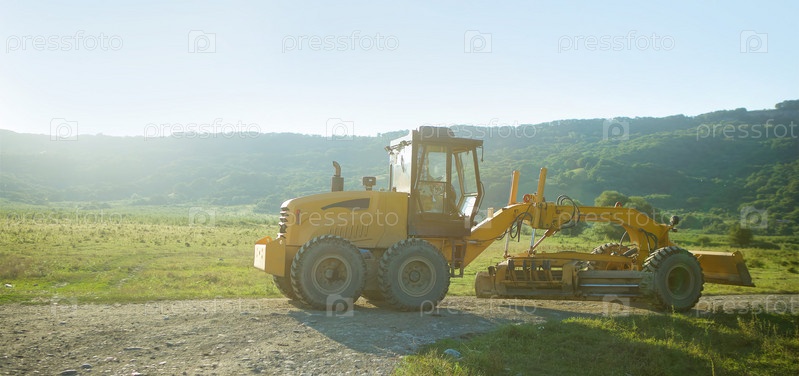Грейдер на гравийной сельской дороге на закате. Промышленные машины для помощи людям