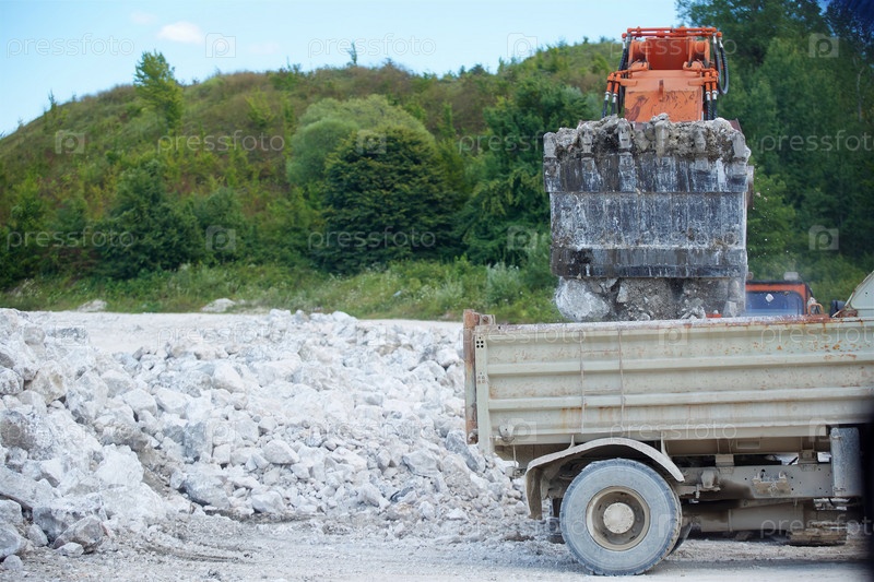 Большой экскаватор засыпает гравий в грузовик в процессе производства. Промышленное предприятие