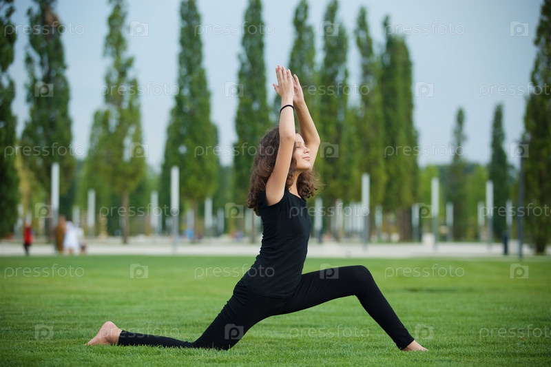 Девочка школьного возраста занимается йогой в спортивной форме, показывает элементы спорта и асан