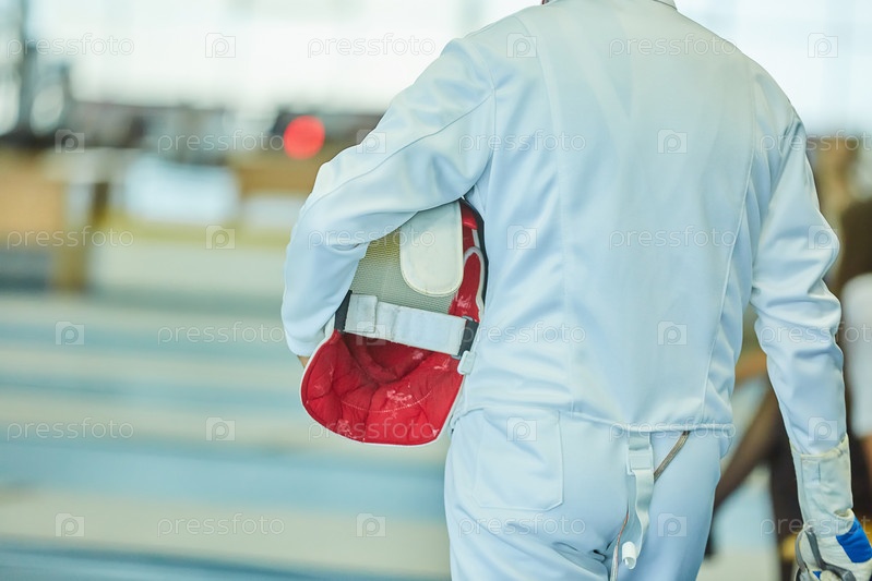 Части тела спортсмена, фехтующего в костюмной форме с мечом и маской. Активный олимпийский вид спорта