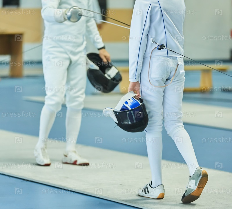 Части тела спортсмена, фехтующего в костюмной форме с мечом и маской. Активный олимпийский вид спорта