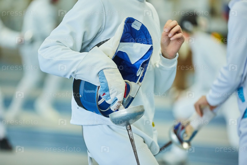 Части тела спортсмена, фехтующего в костюмной форме с мечом и маской. Активный олимпийский вид спорта