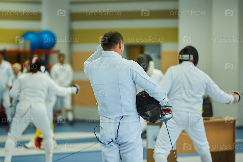 Спортсмены, фехтующие в костюмной форме с мечом и маской, соревнования или разминка. Активный олимпийский вид спорта