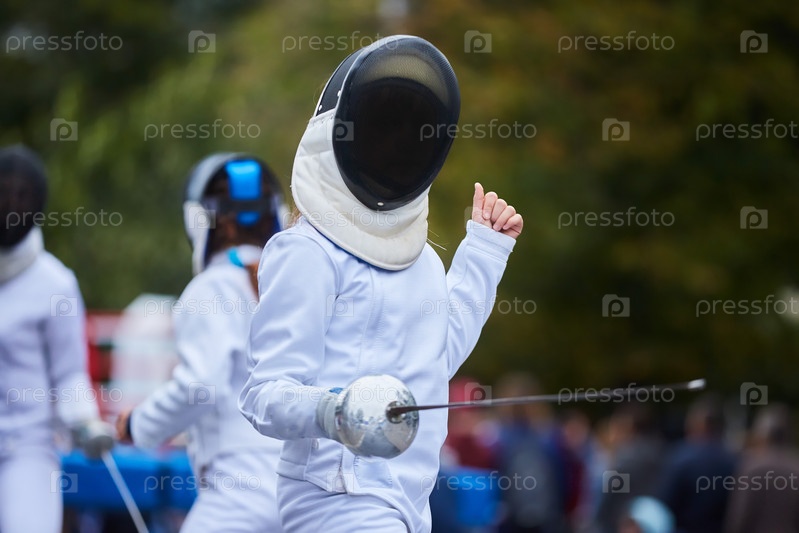 Спортсмены, фехтующие в костюмной форме с мечом и маской, соревнования или разминка. Активный олимпийский вид спорта