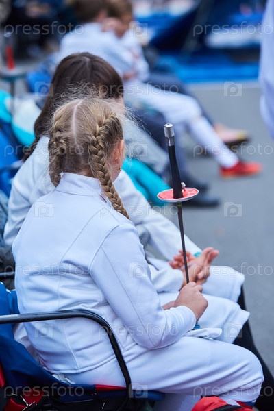 Части тела спортсмена, фехтующего в костюмной форме с мечом и маской. Активный олимпийский вид спорта