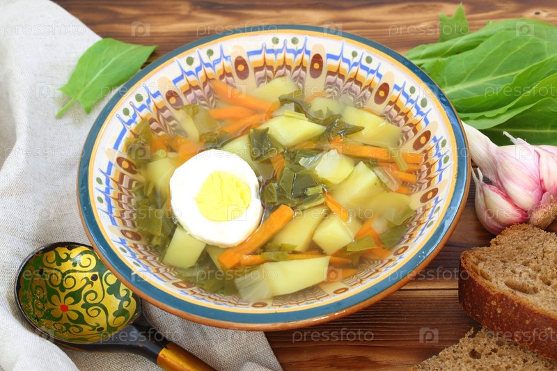 Зеленый борщ со сметаной и ржаным хлебом