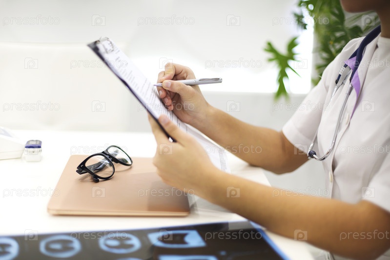 Женщина-врач в маске и униформе заполняет медицинский отчет в буфер обмена в современной комнате в клинике