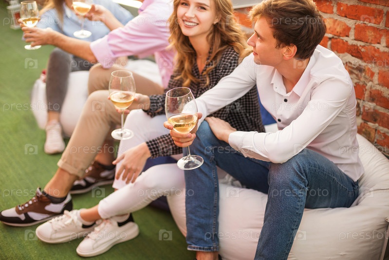 Веселые друзья пьют белое вино во время вечеринки на крыше