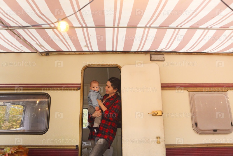 Улыбающаяся счастливая мать с маленьким сыном в доме на колесах