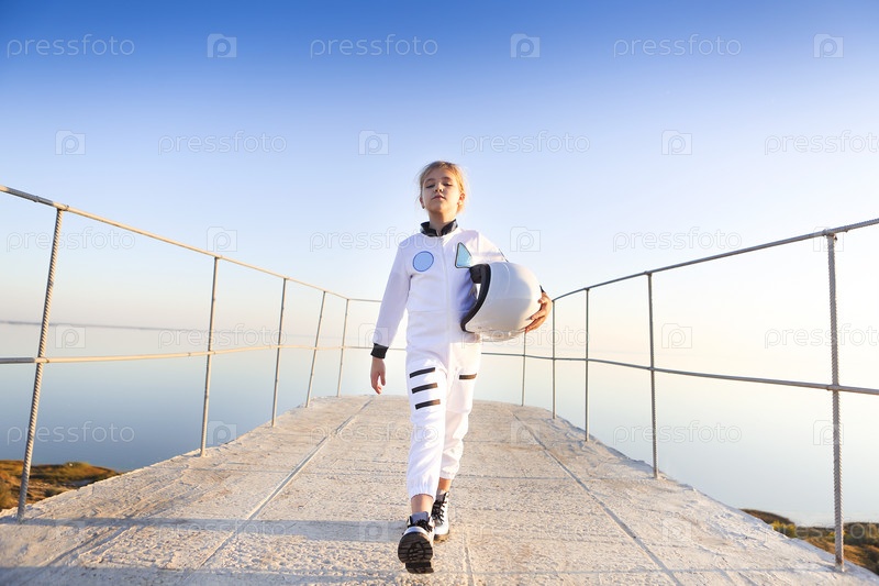 Футуристическая девочка-астронавт в белой полной форме и шлеме в серебряных туфлях на открытом воздухе