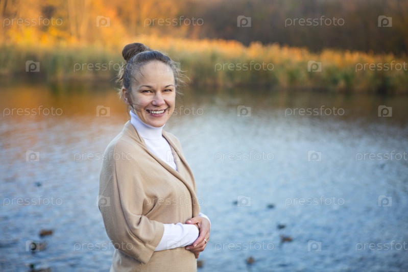 Молодая улыбающаяся женщина в осеннем парке