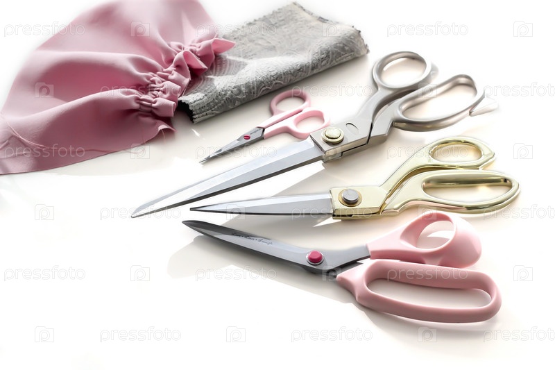Раскладка ножниц для портного и закройщика на белом фоне с оформлением лоскутов тканей