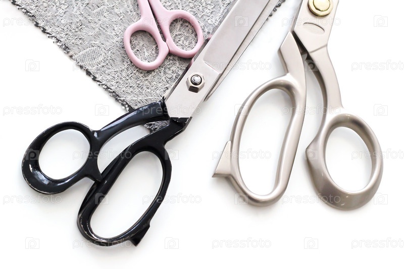 Раскладка инструментов для шитья на белом фоне: ножницы закройщика и лоскут ткани