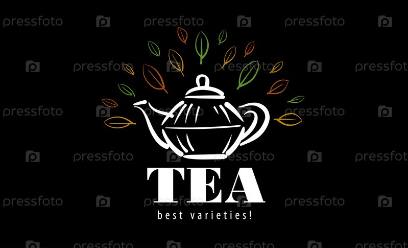 Логотип с раскрашенным чайником и листьями на черном фоне