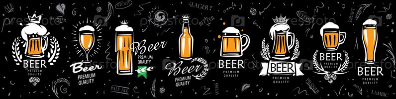 Набор логотипов с раскрашенными пивными кружками на черном фоне