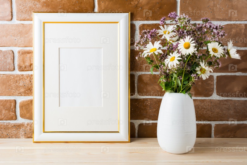 Золотая рамка-макет с букетом полевых цветов на кирпичной стене