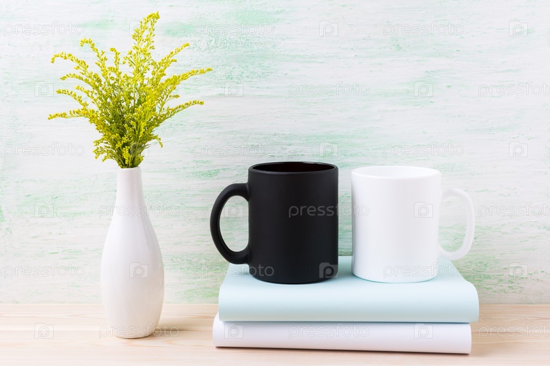 Бело-черный макет кружки с декоративной зеленой цветущей травой