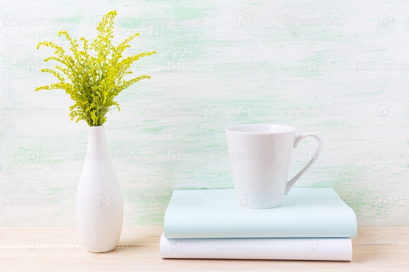 Макет кружки белого кофе латте с декоративной зеленой травой