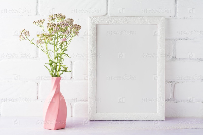 Макет белой рамы со сливочно-розовыми цветами в закрученной вазе