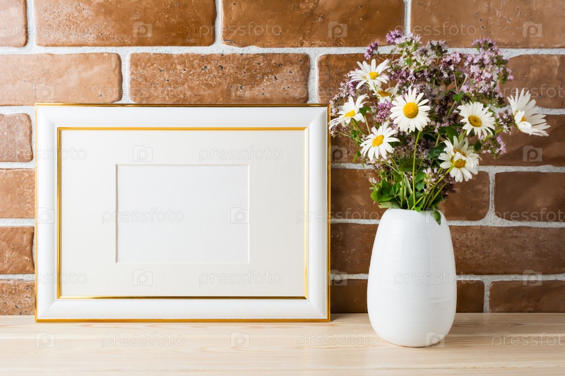 Украшенный золотом макет пейзажной рамки с букетом полевых цветов в стилизованной вазе