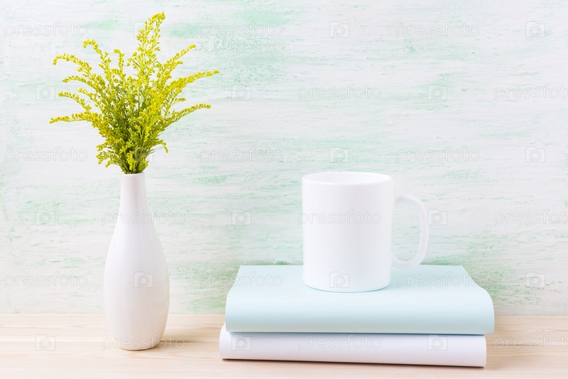 Макет кружки белого кофе с декоративной зеленой цветущей травой