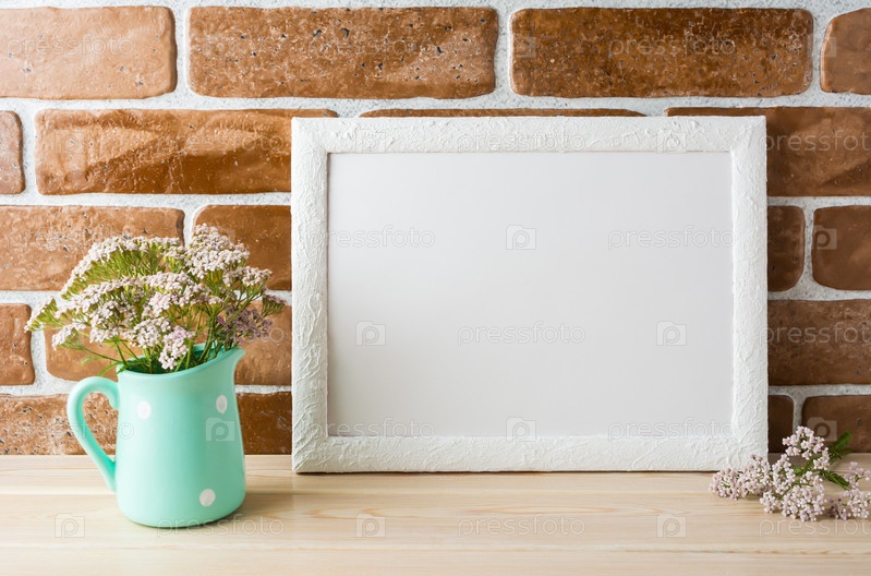 Макет белой пейзажной рамки сливочно-розовые цветы в мятном кувшине