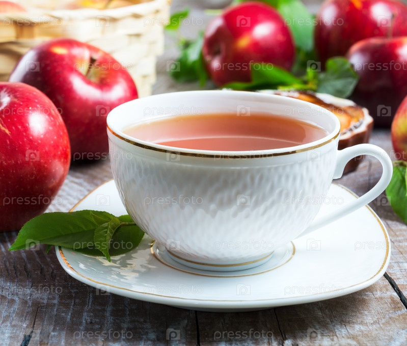 Чашка чая и красные яблоки крупным планом