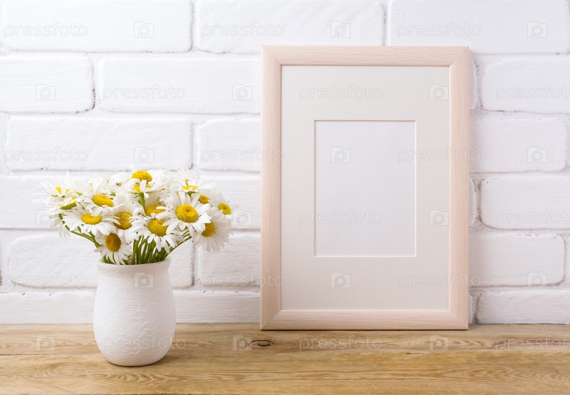 Макет деревянной рамы с букетом ромашки в деревенской вазе