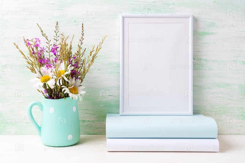 Макет белой рамки с ромашкой и фиолетовыми цветами в мятно-зеленом кувшине и книгах