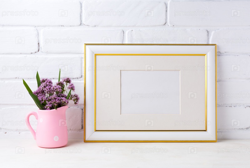 Украшенный золотом макет ландшафтной рамки с фиолетовыми цветами в розовом деревенском кувшине