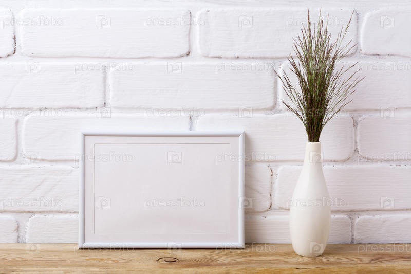 Макет рамки белого ландшафта с темной травой в элегантной вазе