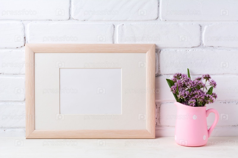 Макет деревянной ландшафтной рамы с фиолетовыми цветами в розовом деревенском кувшине