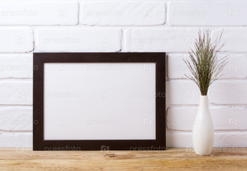 Черно-коричневый макет пейзажной рамки с темной травой в элегантной вазе