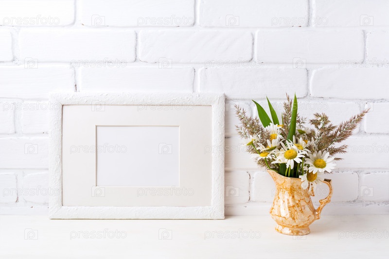 Макет рамки белого пейзажа с ромашкой и травой в золотой вазе