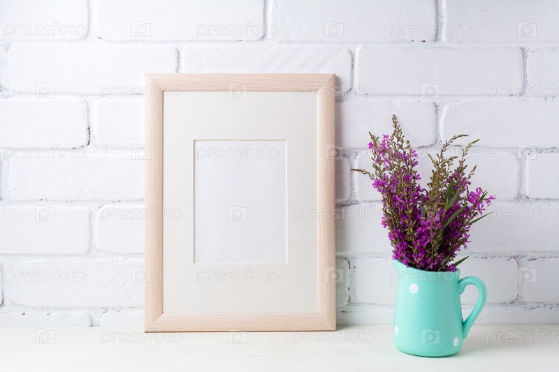 Макет деревянной рамы с темно-бордовыми фиолетовыми цветами в мятном кувшине
