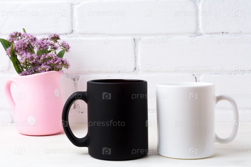 На столе кружки, с фиолетовыми цветами в розовом кувшине в горошек