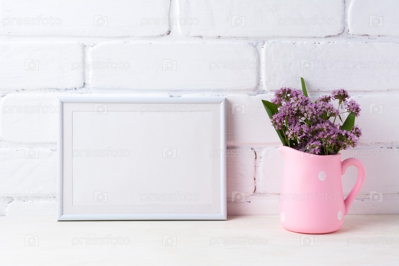 Макет рамки белого цвета для пейзажа с фиолетовыми цветами в розовом кувшине в горошек