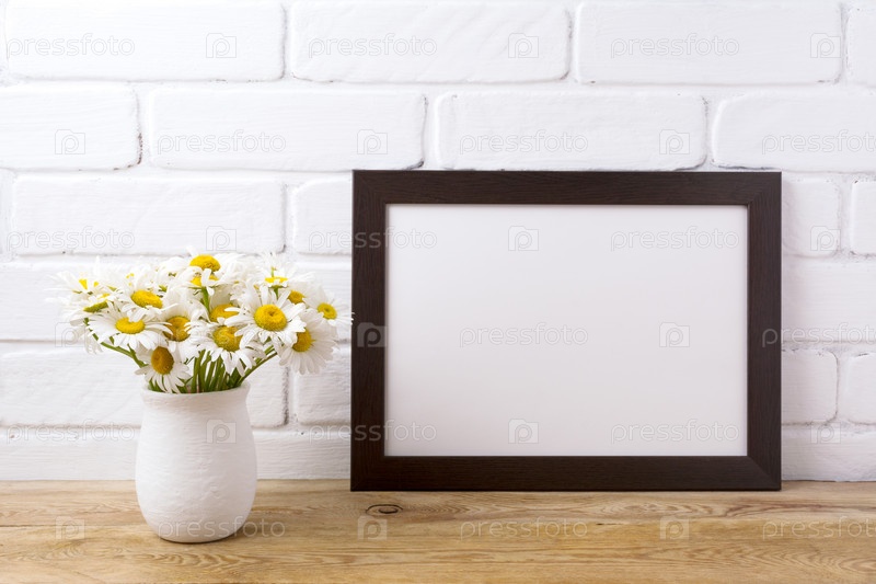 Черно-коричневый макет пейзажной рамки с букетом ромашки в деревенской вазе