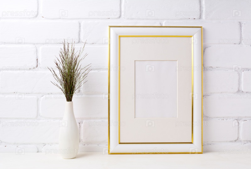 Украшенный золотом макет рамы с темной травой в вазе возле кирпичной стены