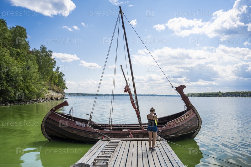 Старинная деревянная лодка на пристани в Богатырской слободе Самарской области в России. Ясный солнечный день 28 июля 2021 года