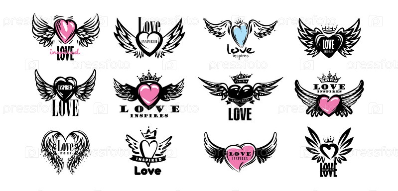 Набор нарисованных векторных иллюстраций сердец и крыльев на белом фоне