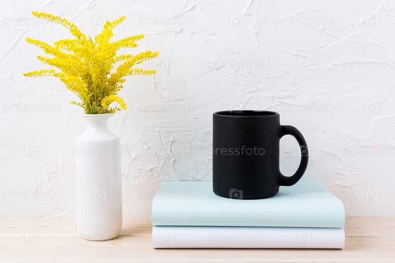 Макет, кружка черного цвета для кофе с декоративной золотой травой и книгами