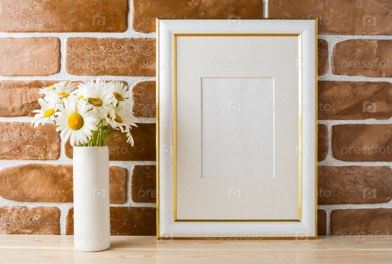 Украшенный золотом макет рамы с букетом ромашек на кирпичной стене
