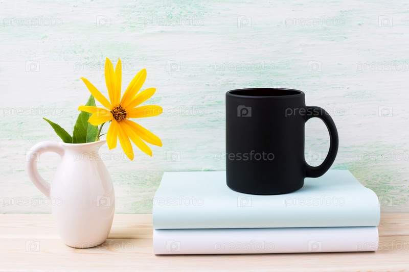 Макет кружки черного цвета для кофе с желтыми цветами в кувшине
